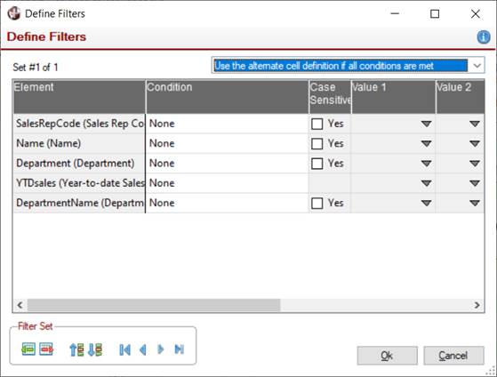 To create an alternate definition for a cell, select a cell and click the Cell Condition button on the Report Designer tool bar. Alternatively, you can select Alternate Cell Condition either from the Format menu or from the right-click popup menu. The Define Filters window displays for specifying the conditions under which the alternate definition will be used.