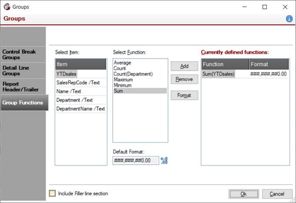 A format display mask is assigned to the function; however, this may be changed for the individual function, or the default may be changed in Report Designer Options.