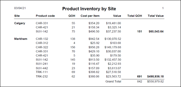 This report is grouped and sorted by Site, which is displayed in bold in the group header line. The various totals are displayed in bold in the group footer line.