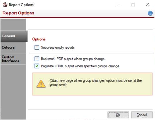 The Report Options window is used to set additional report options, including suppressing empty reports, setting alternating background colours on detail lines and defining a custom output destination.