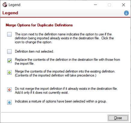 Displays the data source and view definitions in the specified text file, organized by data group, in a tree view format. Select the data source and view definitions to import by expanding a data group and clicking the check box beside the definition name. To deal with duplicate definitions, the list will cycle through a series of merge options, which are represented as symbols inside the check boxes. A legend explaining these symbols is available by clicking the Help button. If a definition exists in more than one group, each occurrence will display the same merge option inside the check box. A different merge option can be selected by clicking the check box again until the desired merge option is displayed. Clicking the check box beside a data group cascades the setting for the group to its subordinate entries. Clicking on the topmost level of the tree selects the definitions in the entire tree. |