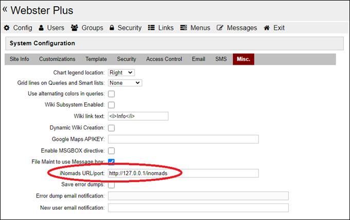 To use the iNomads interface feature in Webster+, you need to first specify the URL required to launch iNomads. This is done in the iNomads URL/port field on the Misc tab in the Webster+ Setup: