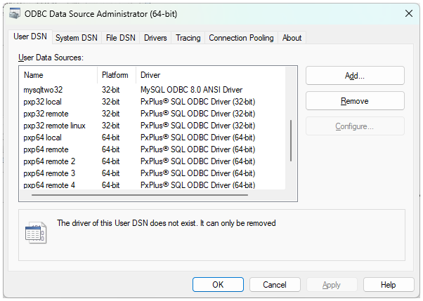 Click on one of the tabs to list the current connections for that DSN type. From here, you can change/remove an existing DSN or add/configure a new one.