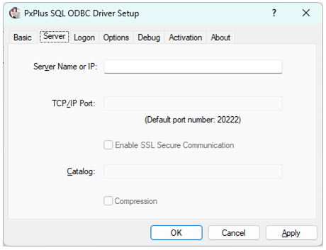 To use the PxPlus SQL ODBC Driver in Client/Server mode, you must configure how to connect to the PxPlus SQL Server. The following Server settings are used: