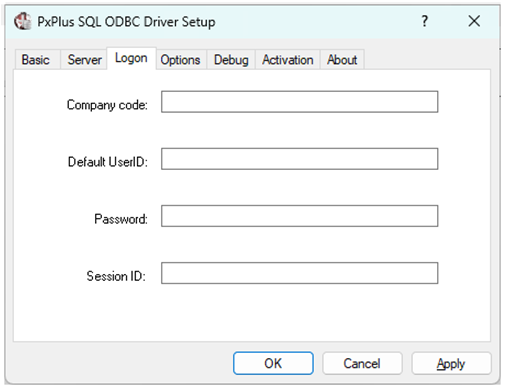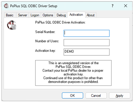 The PxPlus SQL ODBC Driver Setup dialog displays, which allows you to create and configure access to a PxPlus database. This dialog is divided into the following tabbed panels (explained below): Basic, Server, Logon, Options, Debug, Activation and About. |
