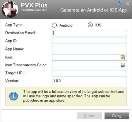 This utility is used to Generate an Android or iOS App for your iNomads application or other Web-based content. The Generated App will have the name and logo specified, and it will be a full screen view of the Web content.