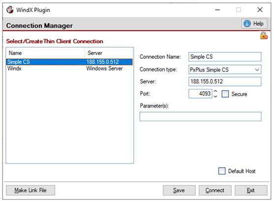 The WindX Connection Manager utility is designed to assist users that have multiple thin-client connections to multiple hosts. The Connection Manager provides users with the ability to define and save connection information in a control file that can later be recalled to simplify connection.