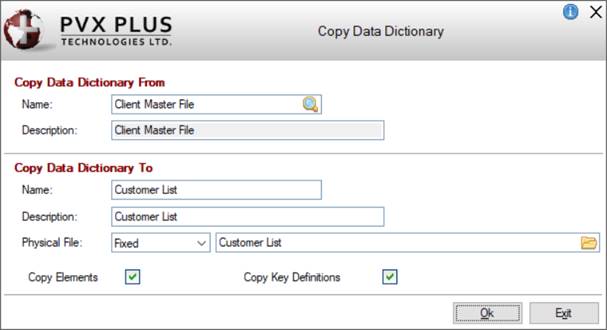 Click OK to proceed with the Copy process. A new data dictionary definition with the defined Name, Description and Physical File is created.