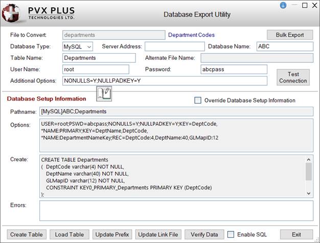 The Bulk Database Export Utility allows you to selectively export multiple table definitions from the PxPlus data dictionary into the specified database. It can also be used to validate native PxPlus data files, load data from native PxPlus data files to the database table, create database link files and add database table entries to the prefix file.