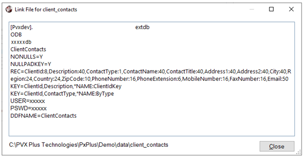 (Available when File Type is a database Prefix File or a database Link File) Button (beside File Type) that is used to display the contents of a database Prefix file entry or Link file in view-only mode. This button is disabled for Native files. Example: (The View Prefix File Entry/Link File Contents button was added in PxPlus 2023 Update 1.) | |||||||||||||||||||||||||||||||||||