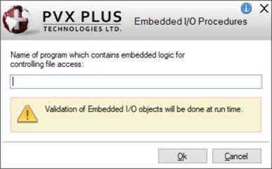 Launches the Embedded I/O Procedures window for entering the name of a program that contains logic for controlling file access. PxPlus provides the ability to specify an object using the syntax obj=xxxxx. |