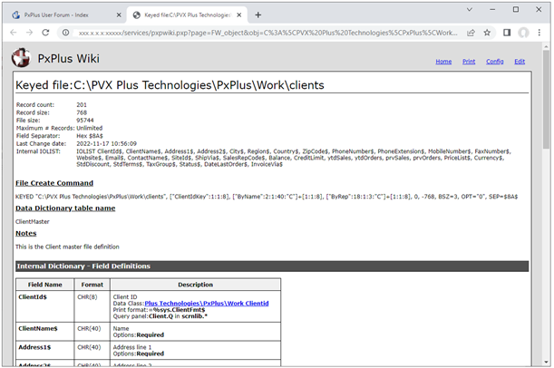 (Not Available when running WindX) Spawns EZWeb for the PxPlus Wiki (if not already running) and then displays the file information for the current table in a new tab on your default Web browser. Example: When the PxPlus Wiki launches, the file information for the current table, Clients, displays: |