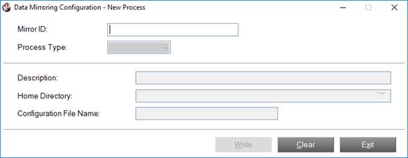 The Data Mirroring Configuration - New Process interface is used to create a new process, It is invoked by selecting the New button on the main Data Mirroring Configuration interface.