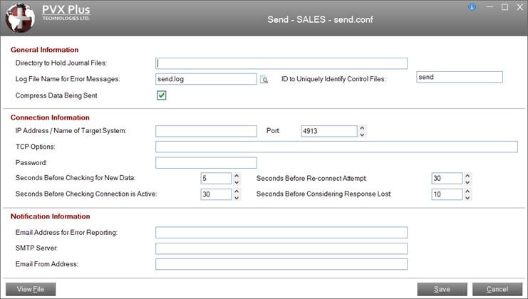 This file (default is send.conf) contains the configuration parameters for the journal transmission program *plus/jrnl/send. This program monitors journal files for updates and sends a series of journal files to another system.