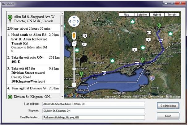 These properties must be set in the map definition and cannot be changed dynamically. In this example, the following settings are used: latitude = 44, longitude = -79, zoom = 8, and the default setting for mapTypeid(hybrid). The showDirectionsPane property has been set to 1 to display directions to the left of the map, and directionsPanePercent has been set to 33, setting the directions display to occupy 33% of the width allotted for the map. | ||||||||||