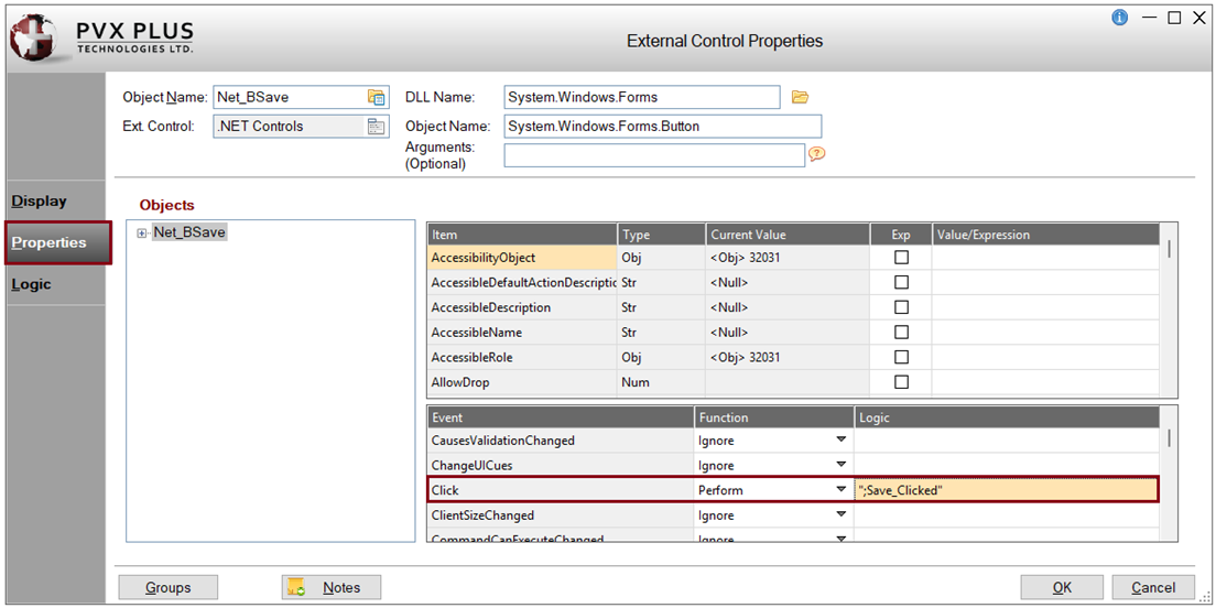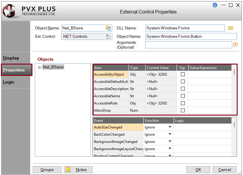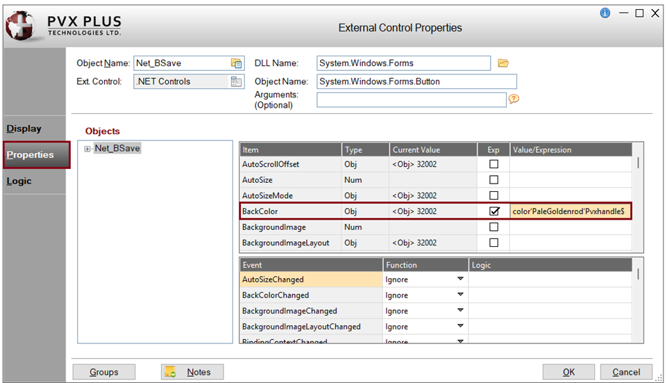 In the NOMADS Panel Designer, double click on the .NET button control on the panel to invoke the External Control Properties window. In the External Control Properties window, click the Properties tab. In the first grid, look for BackColor in the Item column. For this example, you will be setting the color PaleGoldenrod. Select the Exp check box and enter the Value/Expression: color'PaleGoldenrod'Pvxhandle$