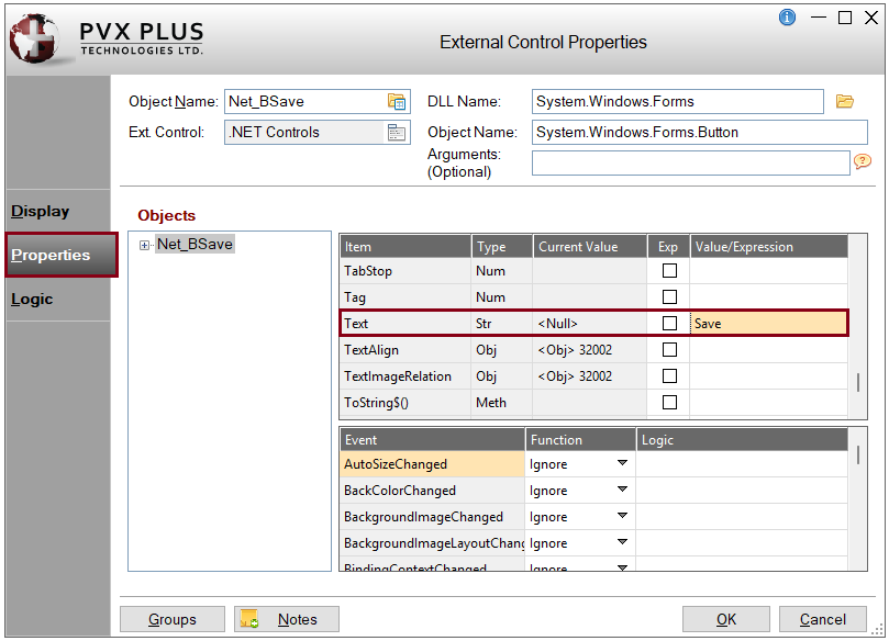 For this example, you will be adding the text "Save" to the .NET button. Under the Item grid column, scroll down the list until you find the word Text. On this row, enter the Value/Expression: Save