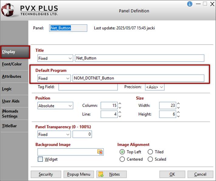 In the NOMADS Panel Designer, invoke the External Control Properties window. Click the Properties tab. In the first grid, look for Image in the Item column. Select the Exp check box and enter the Value/Expression: img'fromfile(image_path$)'pvxhandle$. The FromFile object will look for the specified image location. The Image will default to the center of the text. In the next set of steps, you will be changing the alignment.