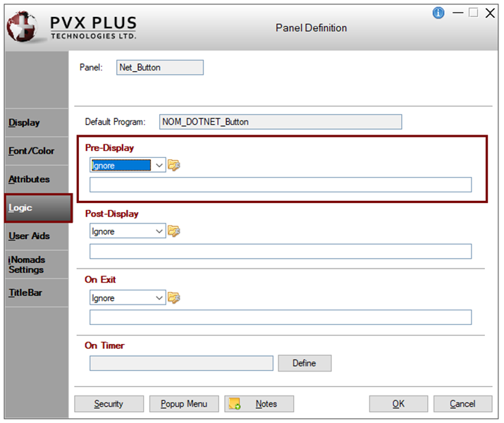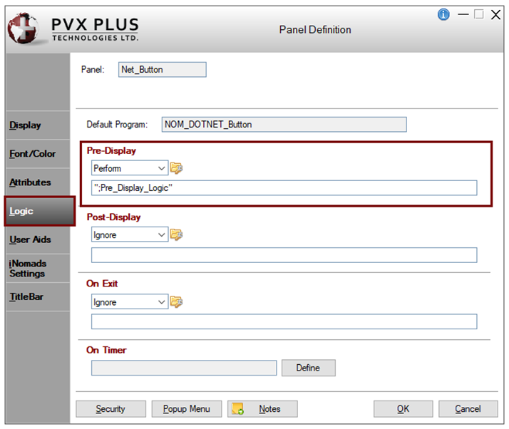 In the header Panel Definition window, click the Logic tab. In the Pre-Display section, you will define a method in the program where you will set some logic to define the other objects needed for adding appearance.
