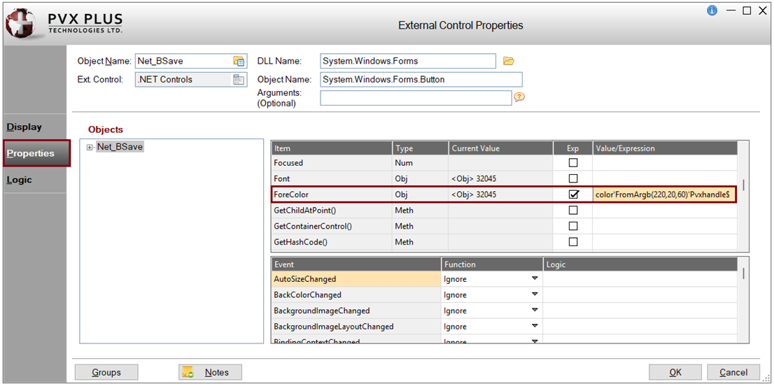 In the External Control Properties window, click the Properties tab. In the first grid, look for ForeColor in the Item column. Select the Exp check box and enter the Value/Expression: color'FromArgb(220,20,60)'Pvxhandle$