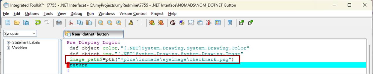 Load the default program, NOM_DOTNET_Button, which you created earlier. For this example, you will be defining another object called Image. The Image object will allow the placement of an image. Insert this line and save the program: def object img,"[.NET]System.Drawing,System.Drawing.Image"