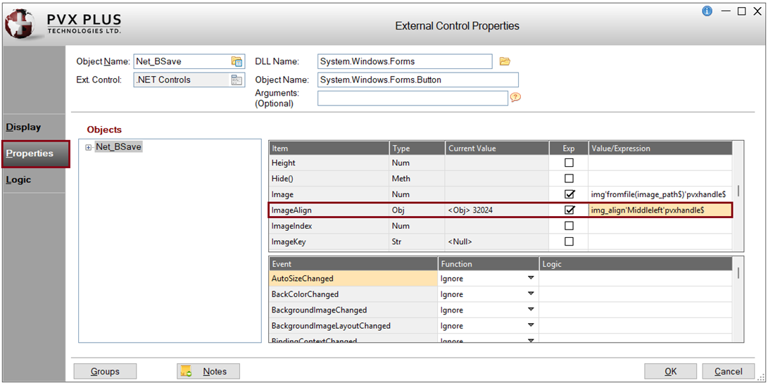 In the NOMADS Panel Designer, invoke the External Control Properties window. Click the Properties tab. In the first grid, look for ImageAlign in the Item column. For this example, align the image to the left of the text. The MiddleLeft property will be used with the ImageAlign property. Select the Exp check box and enter the Value/Expression: img_align'Middleleft'pvxhandle$