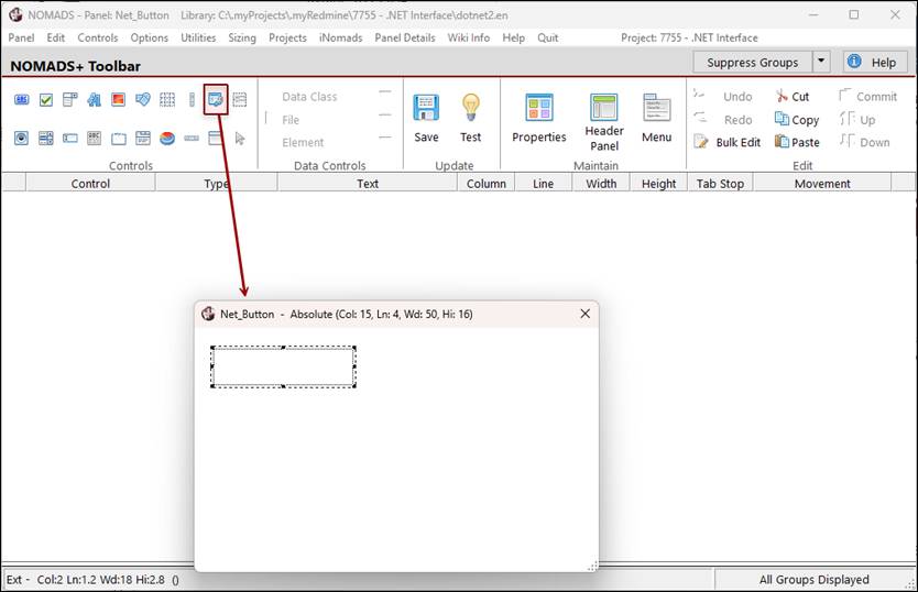 For this example, you will be creating a .NET button control in NOMADS. You will be adding various button properties (i.e. color and text) and creating an event when the button is pressed using the new interface.