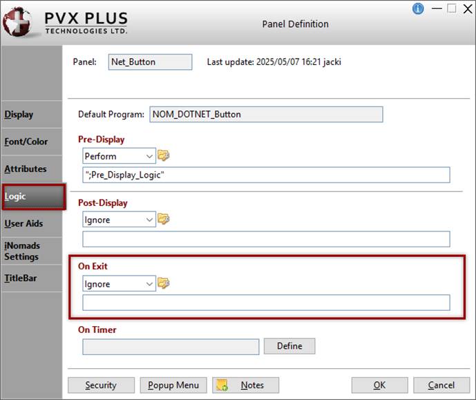 If the program is not already loaded in the editor, click the Program Logic button to the right of the drop box to load the default program, NOM_DOTNET_Button. Insert this method and save the program: On_Exit_Logic: