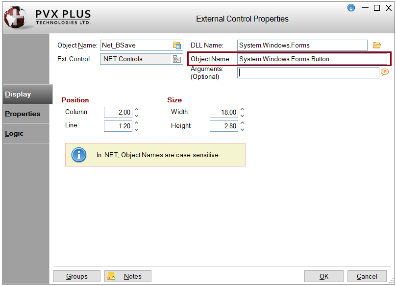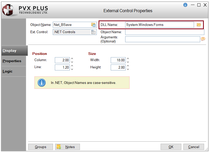 You can optionally pass in arguments when creating .NET objects. These arguments can be strings, numbers, or .NET object handles. See PvxHandle$. In the Arguments (Optional) field, enter any optional arguments used by the .NET control. These arguments can be either a PxPlus numeric or string variable or a numeric or string literal. String literals must be quoted. Multiple numeric or string arguments can be specified and must be separated by commas. For this example, leave this field blank. |