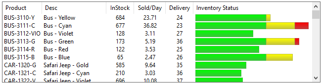 Grids can also include horizontal bars in cells by setting the Cell Type to BarChart and setting the cell's 'Text$ property to the percentage to fill and the colors desired.