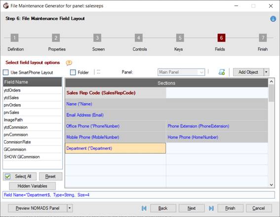 To define the field layout for the panel, proceed to Step 6: File Maintenance Field Layout by clicking the Next button five times or by clicking the number 6 button at the top. | |||