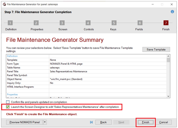 Select the Launch the Screen Designer to edit 'Sales Representatives Maintenance' after completion check box. | |||
