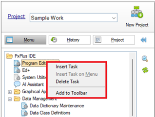In the Menu tree view, the Program Editor (*IT) task is still highlighted. Right click on this task to open a menu with additional options. The first and second options, Insert Task and Insert Task on Menu (currently disabled), both launch the