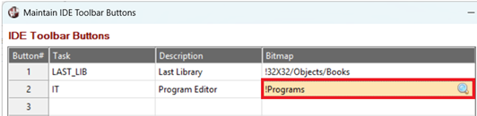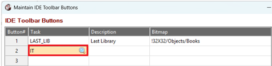 You will be adding Button #2 for the Program Editor (*IT) task. On the second row, under the Task column, enter IT. This is the Task ID for the *IT Program Editor. You can also select it from a list by clicking the lookup button (magnifying glass). |
