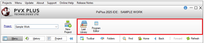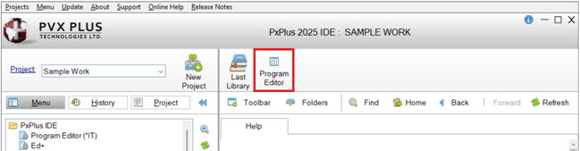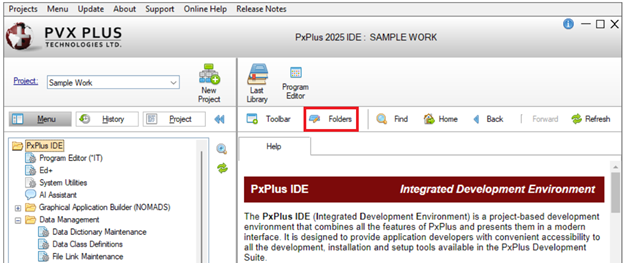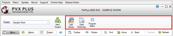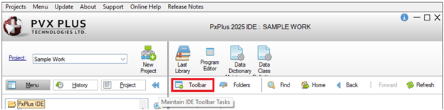 When launched from a Windows platform, the IDE can be displayed in enhanced view or in standard view. The main difference between these views is that the enhanced view has additional functionality and can be customized. You can add folder tabs to launch helpful Web pages with just a single click. A Help tab is already provided to display the PxPlus Online Help information for the current task. You can add buttons to the IDE ribbon toolbar to quickly access commonly used PxPlus tasks.