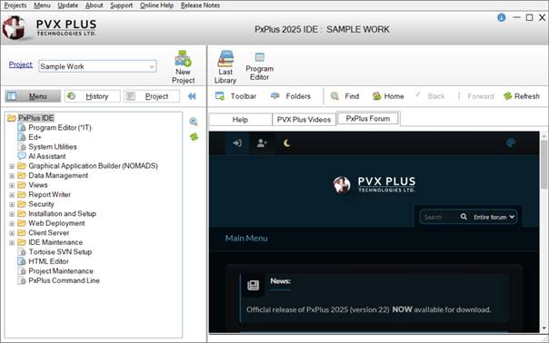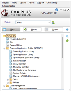The PxPlus Integrated Development Environment (or IDE) is a project-based development environment that integrates all of the various features of PxPlus in an easy-to-use interface. The PxPlus IDE can be accessed from a Windows platform or from a Web browser.