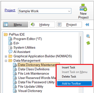 Selecting this button displays a list of PxPlus tasks that have been added to the selected project. |
