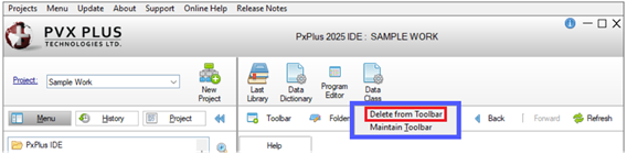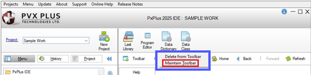 Invoke the Maintain IDE Toolbar Buttons window. This can be done by using one of the following methods: Method 1: Click the Toolbar button below the ribbon toolbar. OR Method 2: In the ribbon toolbar, right click on the task button that you want to edit and then select Maintain Toolbar from the popup menu. |