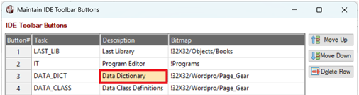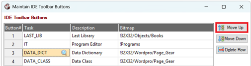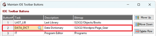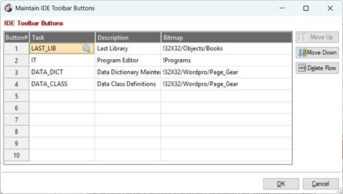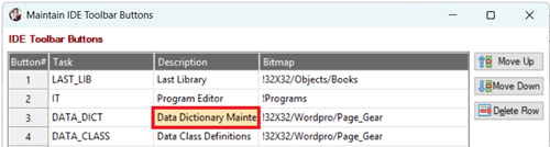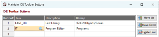The Maintain IDE Toolbar Buttons window opens. It is used to add, maintain and delete task buttons in the IDE ribbon toolbar. |