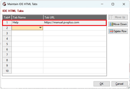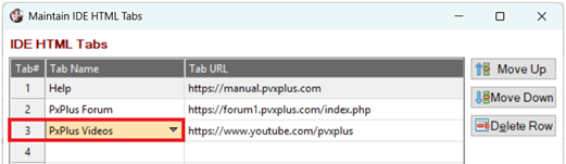 The Maintain IDE HTML Tabs window opens. Tab #1, which is named Help, is already provided. It cannot be modified, deleted or moved. |