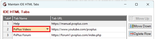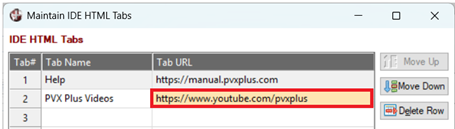 You will be adding Tab #2 to launch the PVX Plus YouTube page. Under the Tab Name column, enter PVX Plus Videos as the name to appear on the folder tab. |