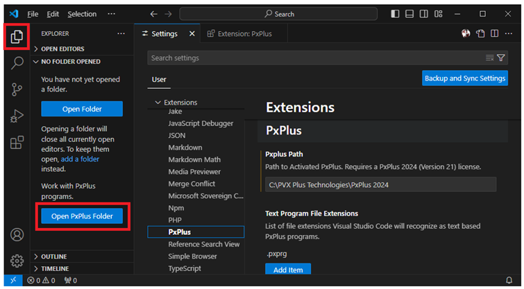 Select the directory where the program to edit is located. This is done by using one of the following two methods: Method 1: Click the PxPlus icon in the upper right corner. OR Method 2: On the Activity Bar on the far left side of Visual Studio Code, click the Explorer icon. This displays the Extensions view. Click the Open PxPlus Folder button. |
