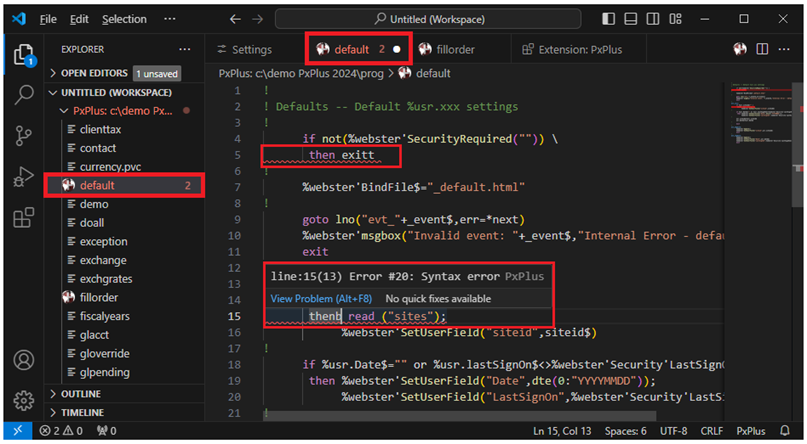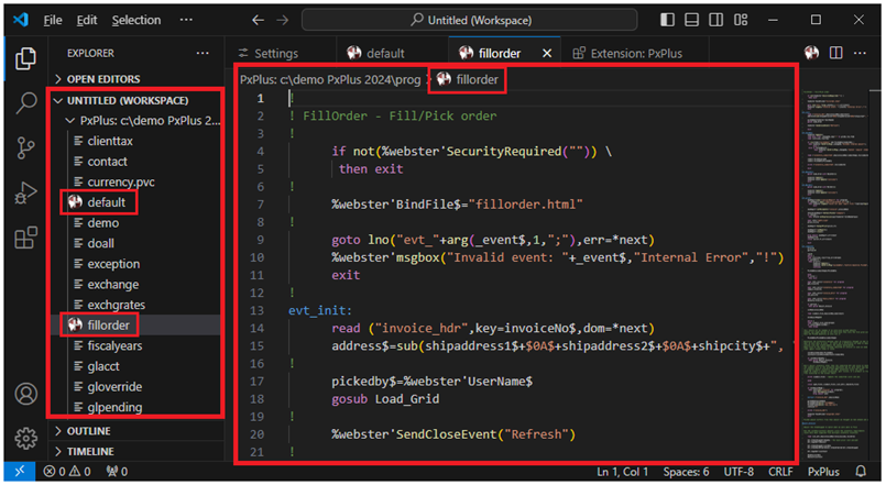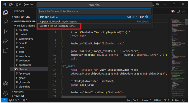 PxPlus programs and text-based PxPlus programs that are opened via this PxPlus Extension are recognized as PxPlus programs by Visual Studio Code. This enables all the Visual Studio Code features and allows PxPlus programs to be edited with syntax checking.