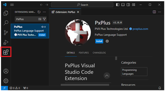Find the PxPlus extension by entering PxPlus in the Search Extensions in Marketplace input box. |
