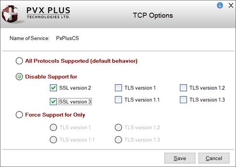(Simple Client Server Only - Available when an SSL Certificate is entered) Button that is used to display the TCP Options window to allow certain SSL protocols to be disabled or forced. These checkboxes are applicable only when an SSL Certificate has been entered. If anything other than All Protocols Supported (default behavior) is selected and saved, a check mark will display on the Security Options button. See PxPlus Simple Client-Server Interface. If desired, support for various protocols may be disabled by selecting the Disable Support for radio button and then selecting the protocols to be disallowed. Alternatively, the Force Support for Only radio button option allows only one selected protocol to be used. (The Security Options button was added to the Simple Client Server grid in PxPlus 2020.) | |