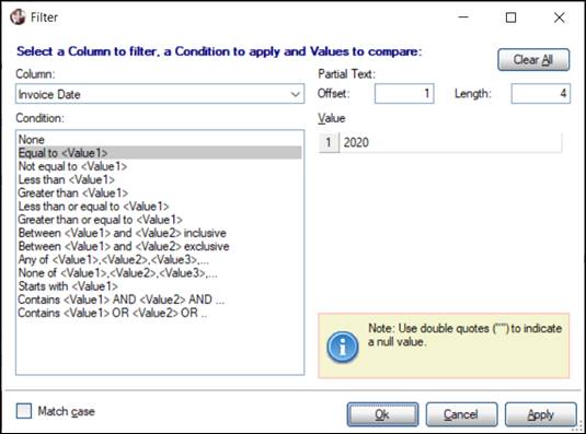 Conditions that can be applied to column filters are: