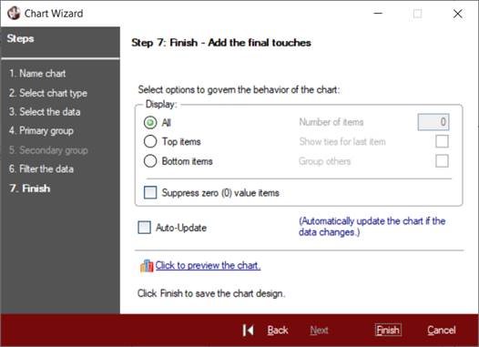 The Display options allow you to choose to display All items or a certain number of Top items or Bottom items. If you select either Top items or Bottom items (i.e. items with the highest or lowest values), you must indicate the Number of items to display. You must also indicate whether to show all items tied for the last position and whether to group the remaining results as "Other". The Suppress zero (0) value items check box is used to suppress any items with a value of zero. These options are not available to charts with secondary data groups (see Step 5).