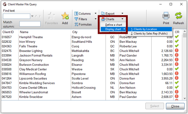 To display an AutoChart, click the Charts button at the top of the Query or right click on the data list to invoke the popup menu. If an AutoChart definition exists for the control, a Charts > Display Chart option will display in the popup menu.