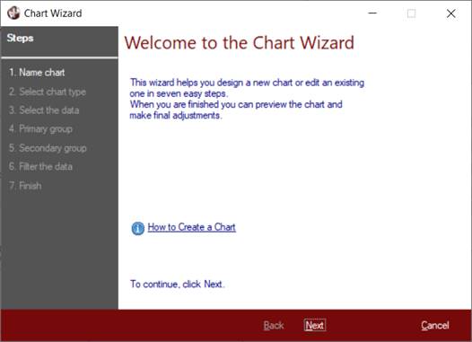 Invoking the Chart Wizard displays the Welcome panel, which provides a How to Create a Chart link that launches PxPlus Help documentation. Click Next to proceed to the first step.