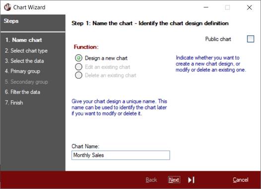 Give the new chart definition a unique and meaningful Chart Name so that it can be identified later when displaying, editing or deleting it.